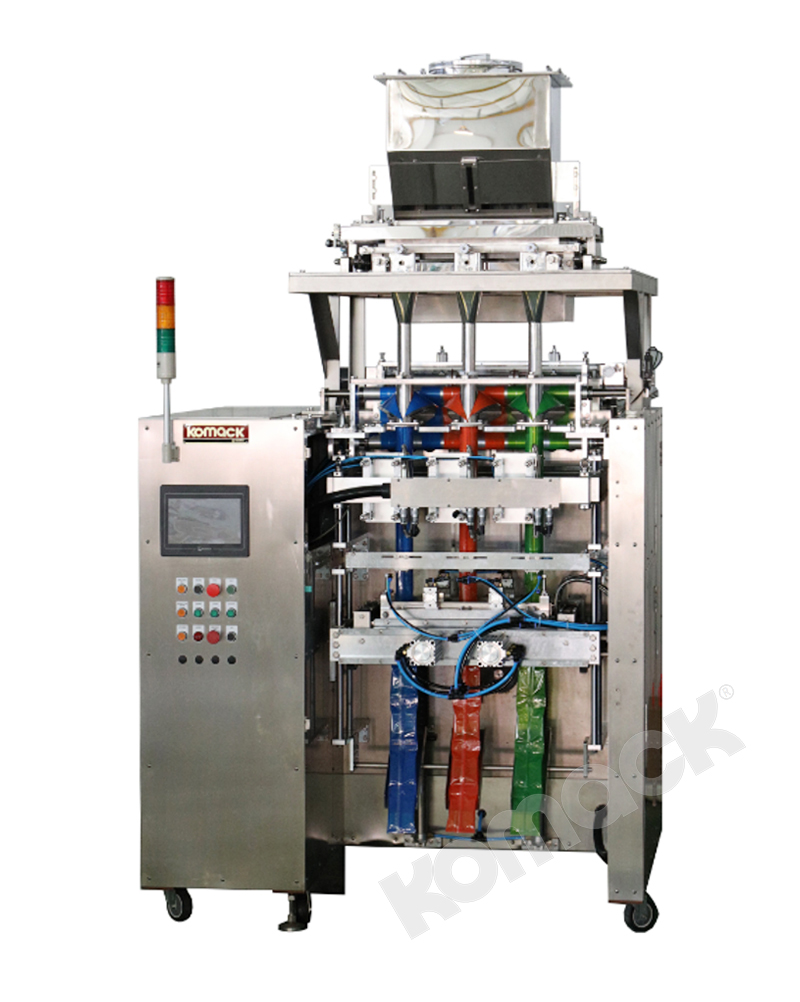1.本機是對充填固形物而開發的多列式背封狀包裝機,可搭載多頭稱、直線振動器等計量裝置。
